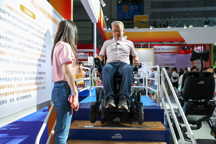 2025年9月12日,在2025深圳國際智慧養(yǎng)老產(chǎn)業(yè)博覽會上,觀眾在展會現(xiàn)場體驗一款可以上下樓梯的智能出行機器人。新華社記者 梁旭 攝