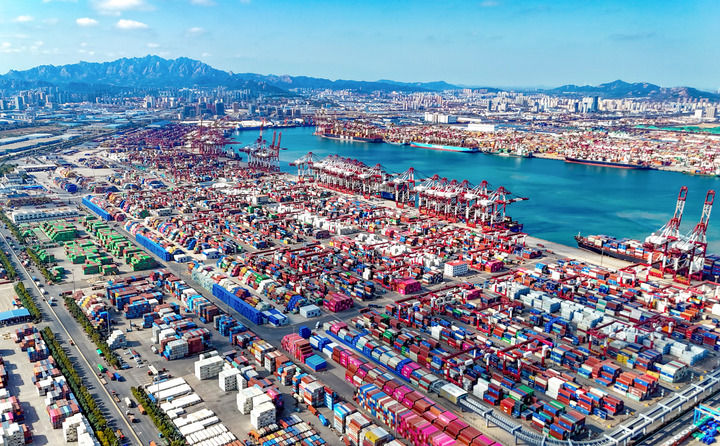 貨輪在青島自貿(mào)片區(qū)裝卸貨物(2025年11月5日攝,無人機照片)。新華社發(fā)(張進剛攝)