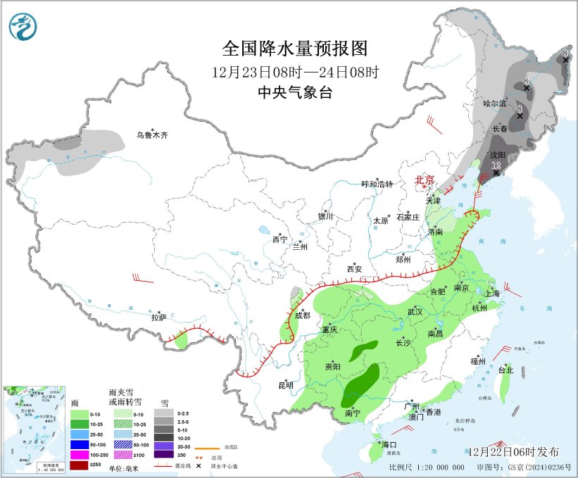 12月23日08時(shí)至24日08時(shí),東北地區(qū)、新疆南疆西部山區(qū)、華北東部、山東北部等地部分地區(qū)有小到中雪或雨夾雪,其中,黑龍江中東部、吉林中部、遼寧東部局地大到暴雪(10~12毫米)。黃淮東部、江淮、江漢大部、江南北部和西部、西南地區(qū)東部、廣西、廣東東南部沿海、海南島東部、臺(tái)灣島東部等地部分地區(qū)有小雨,其中,湖南西部、貴州東北部、廣西中部等地部分地區(qū)有中雨。內(nèi)蒙古中東部、遼東半島、西藏中北部等地部分地區(qū)有4~6級(jí)風(fēng);渤海、渤海海峽、黃海大部海域、東海西部海域、臺(tái)灣海峽、巴士海峽、南海北部海域?qū)⒂?~7級(jí)大風(fēng)、陣風(fēng)8~9級(jí)。