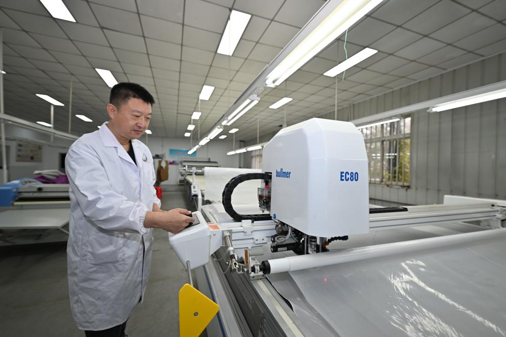 工人在天津紡織集團(tuán)(控股)有限公司智能化生產(chǎn)車間內(nèi)操作自動(dòng)切布機(jī)。新華社記者孫凡越 攝