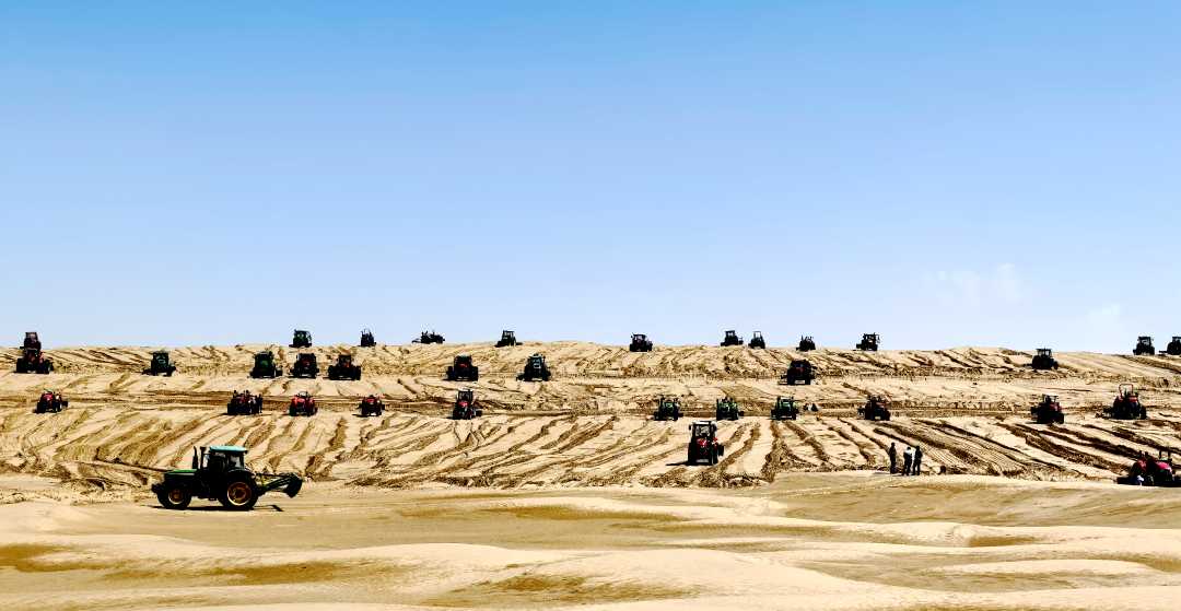 于田縣結(jié)合沙丘地形特點(diǎn),將20米至40米高的高大沙丘分段平整為“梯田”,在沙丘頂部種植喬灌草,斜坡處鋪設(shè)草方格,沙丘底部栽種梭梭、紅柳、酸棗等固沙植物。該縣創(chuàng)新探索的“梯田治沙”模式,相較以往將沙丘整體平整后再種植防沙作物的方式,成本降低約80%。