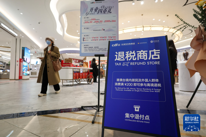 2025年11月28日在天津市內(nèi)免稅店拍攝的退稅商店集中退付點(diǎn)標(biāo)牌。新華社記者 孫凡越 攝