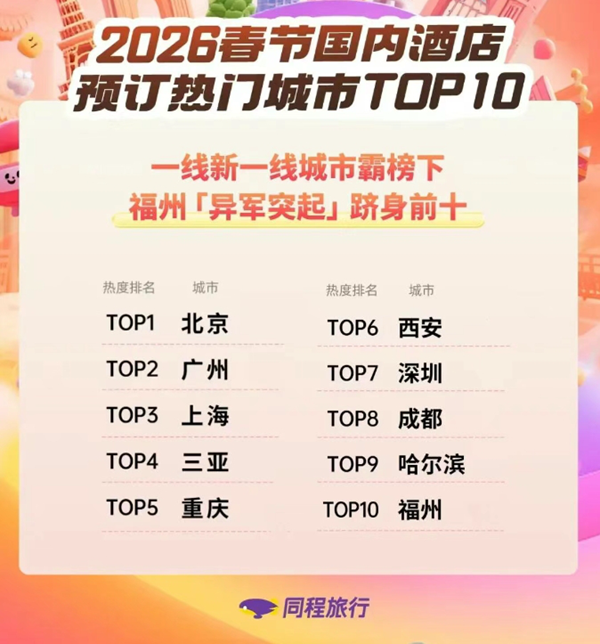 同程旅行數(shù)據(jù)顯示,春節(jié)國(guó)內(nèi)酒店預(yù)訂熱門(mén)城市TOP10榜單,基本被一線、新一線城市霸榜,但“國(guó)家歷史文化名城”福建福州闖出一席之地,躋身第10名。2025年,三坊七巷、煙臺(tái)山、上下杭等3個(gè)街區(qū)全年接待游客超5500萬(wàn)人次,創(chuàng)歷史新高。