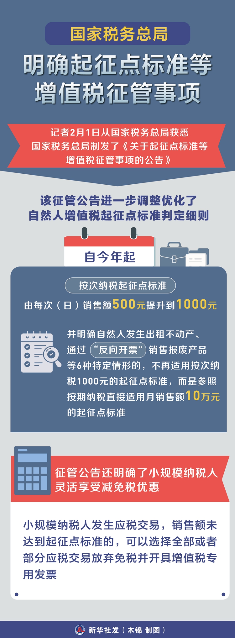 記者2月1日從國(guó)家稅務(wù)總局獲悉,國(guó)家稅務(wù)總局制發(fā)了《關(guān)于起征點(diǎn)標(biāo)準(zhǔn)等增值稅征管事項(xiàng)的公告》,就起征點(diǎn)標(biāo)準(zhǔn)判定、稅收優(yōu)惠政策適用等增值稅征管事項(xiàng)作了進(jìn)一步明確,細(xì)化操作要求,推動(dòng)增值稅法及其實(shí)施條例落實(shí)落地。