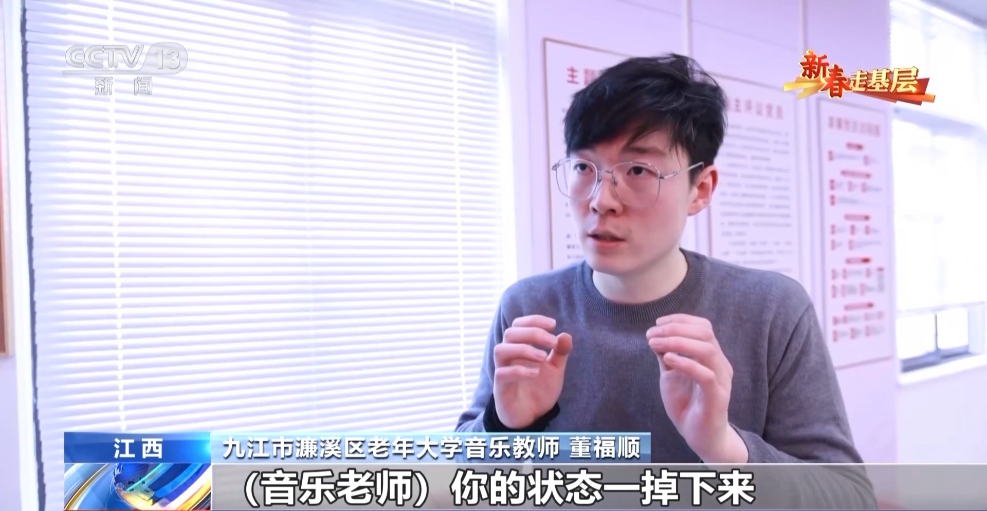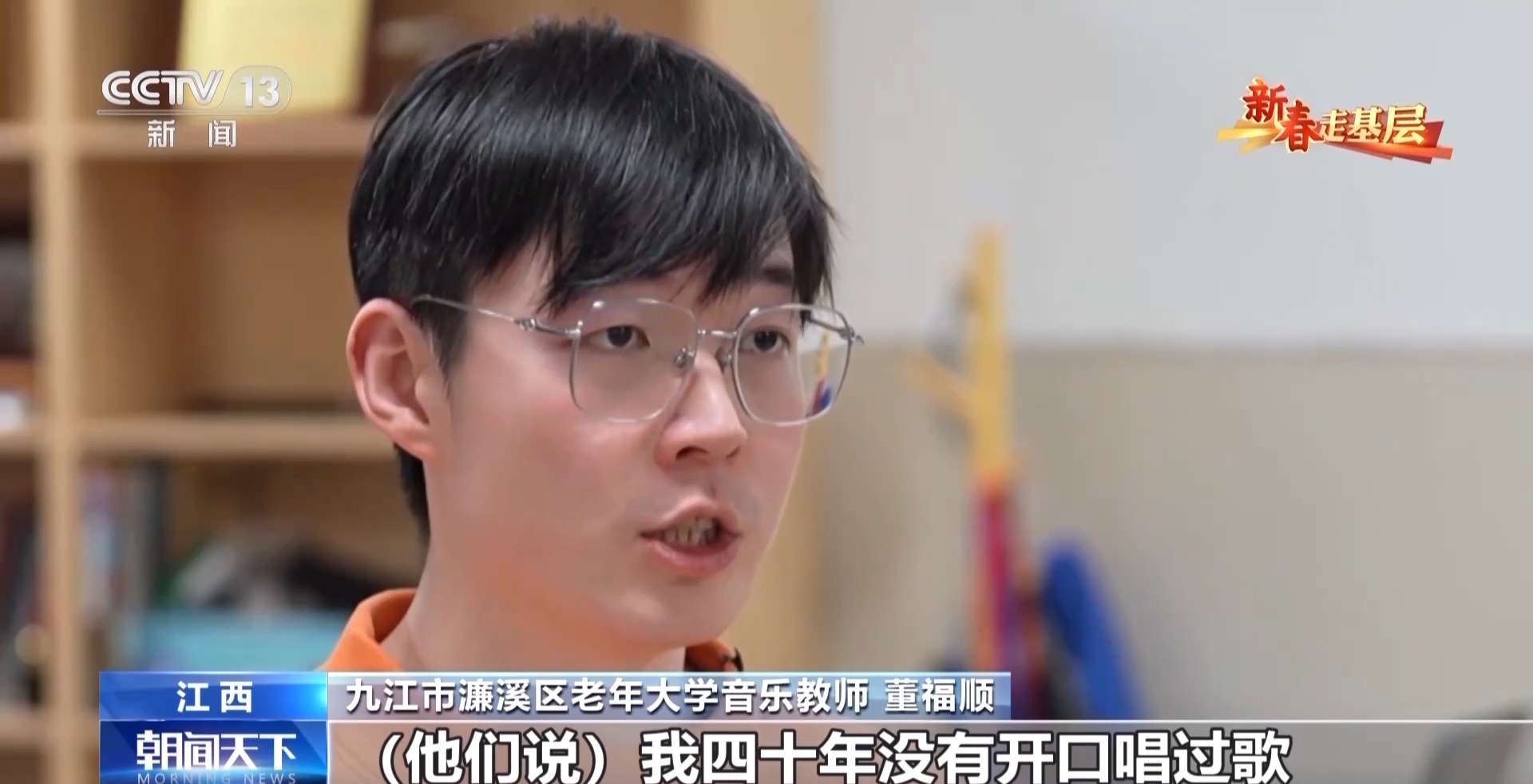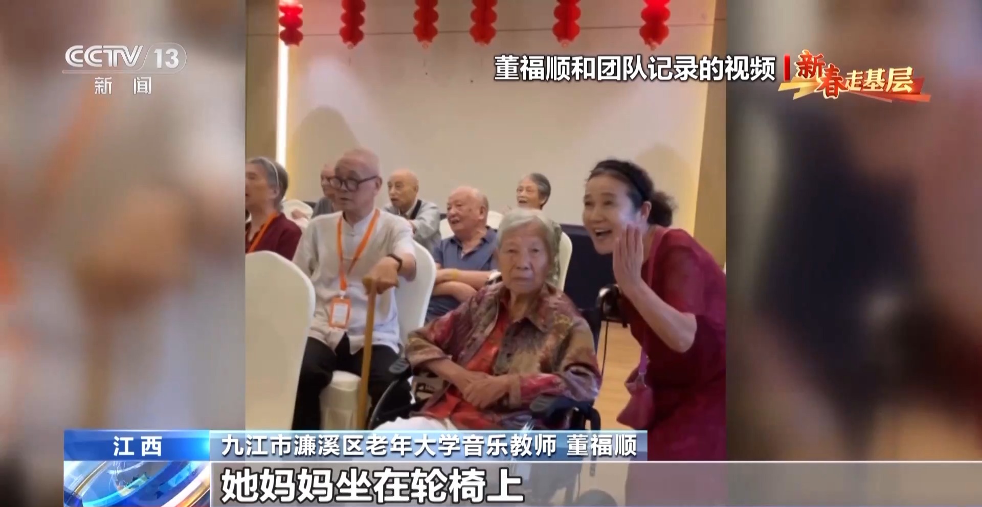 九江市濂溪區(qū)老年大學(xué)音樂教師 董福順:我去了之后,他們說我四十年沒有開口唱過歌,已經(jīng)很久很久,他們說都快忘了這首歌的歌詞了,你過來了,讓我想起了它。所以我覺得我又一次被認(rèn)可了,我也覺得是他們?cè)诮o我一點(diǎn)能量,當(dāng)看著他們唱回憶起的這些歌曲的時(shí)候,他們坐直了,開始朝我揮手去唱,我覺得這件事做對(duì)了。