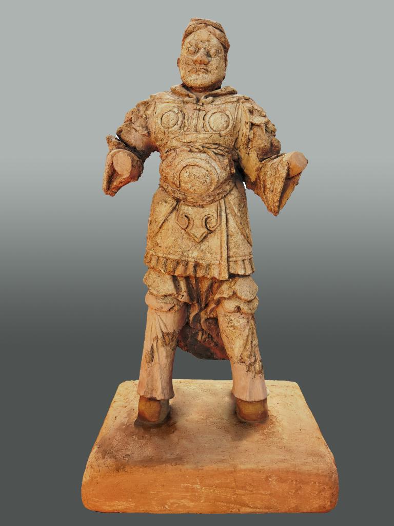 這是庫車市友誼路墓群發(fā)掘出土的武士泥俑。(新疆文物考古研究所供圖)