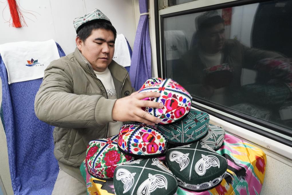 他的鄰座,喀什市商戶艾麥提·阿卜杜熱依木將一頂頂花帽在小桌上細(xì)心排開(kāi)。石榴花、巴旦木紋在艷麗的底色上綻放,針腳細(xì)密如繡?!昂芏嘣谀辖ぷ魃畹呐笥?,過(guò)年要回老家,”艾麥提一邊整理一邊說(shuō),“挑選一頂花帽回家,是份地道的新疆心意?!?/p>