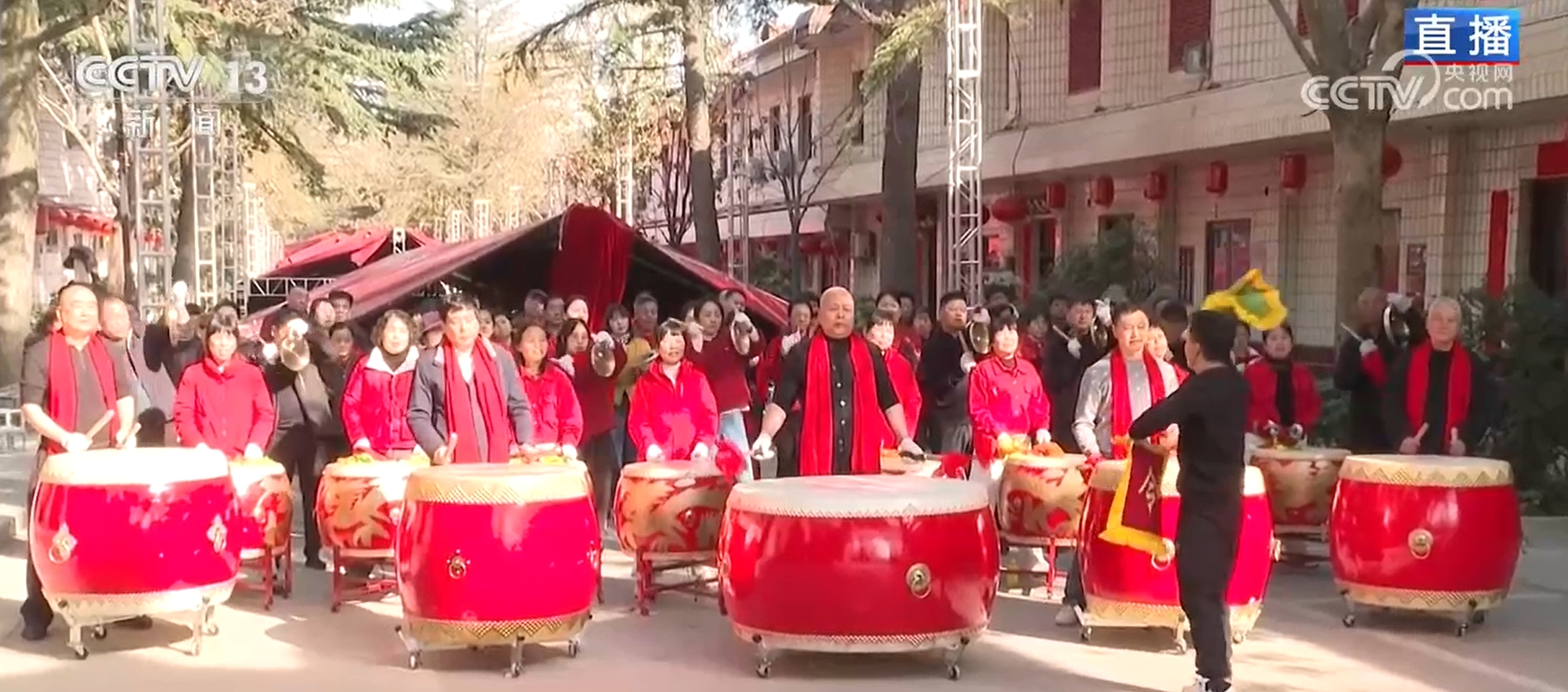 總臺(tái)記者 張恩雨:此刻,我是在袁家村的村口,同時(shí)也是村里百人鑼鼓隊(duì)表演的現(xiàn)場(chǎng)。在陜西關(guān)中農(nóng)村地區(qū),每年過(guò)年每個(gè)村子都會(huì)有這樣的鑼鼓表演,村民們告訴我,鑼鼓聲一響,年就到了。大家可以看到,我身后的鑼鼓隊(duì)隊(duì)員們是激情昂揚(yáng)、氣勢(shì)如虹。這些鏗鏘有力的鼓點(diǎn),正是關(guān)中地區(qū)非常有名的曲目《秦漢戰(zhàn)鼓》,沒(méi)有繁復(fù)的花腔,而是重在力量和氣勢(shì)。特別值得一提的是,這支隊(duì)伍里年齡最大的已經(jīng)75歲,最小的只有26歲,而且所有人都是零基礎(chǔ)的村民,僅僅集中學(xué)習(xí)了10來(lái)天,就呈現(xiàn)出了今天這樣的氣勢(shì)。