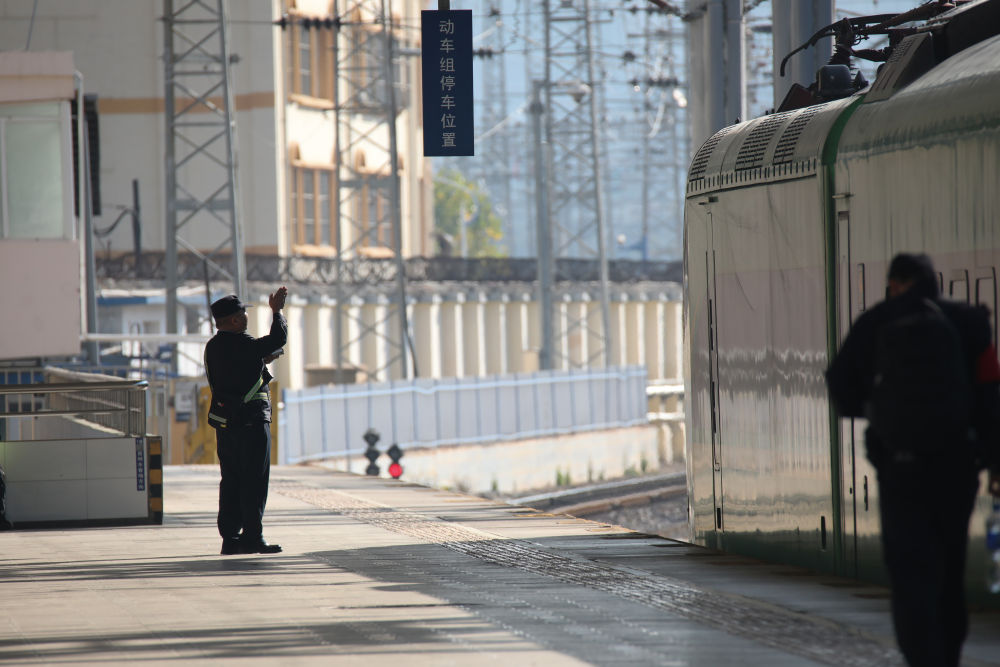 ↑ 2月16日,在南京火車站,乘務(wù)人員在站臺(tái)上解答旅客問詢。新華社發(fā)(蘇陽(yáng)攝)