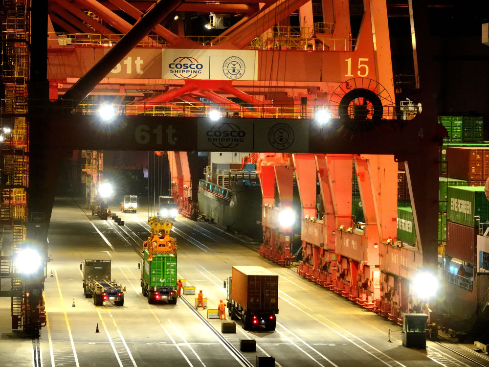 ↑ 2月16日凌晨,江蘇省連云港港集裝箱碼頭燈火通明,工作人員在運(yùn)輸、裝卸集裝箱(無(wú)人機(jī)照片)。新華社發(fā)(王春攝)