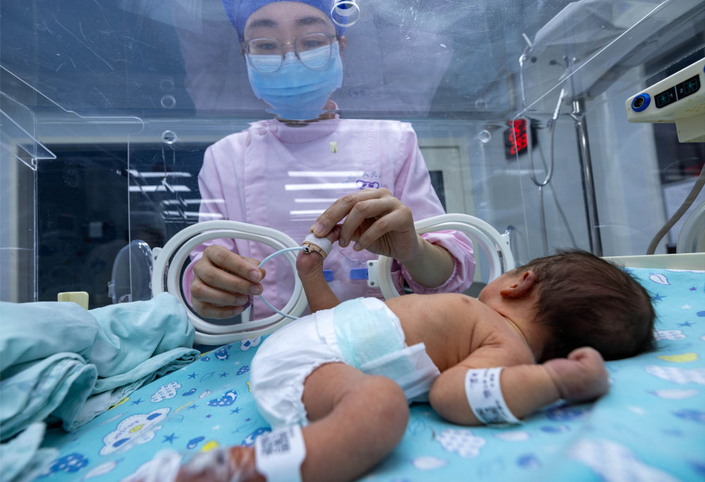 ↑ 2月16日,在南京醫(yī)科大學(xué)附屬泰州人民醫(yī)院新生兒科,護(hù)士為新生兒護(hù)理。新華社發(fā)(湯德宏攝)