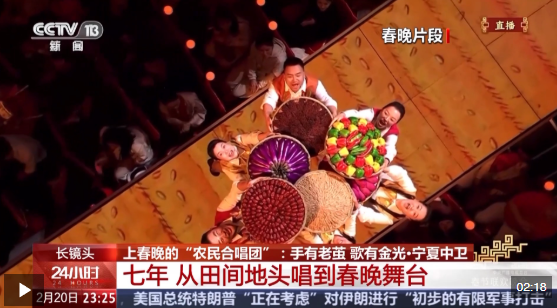除夕夜,寧夏中衛(wèi)市中寧縣大戰(zhàn)場鎮(zhèn)農(nóng)民合唱團(tuán)登上央視春晚舞臺,與廖昌永、鳳凰傳奇等知名歌手同臺,用最質(zhì)樸的嗓音,唱出《來曬秋》的豐收喜悅。