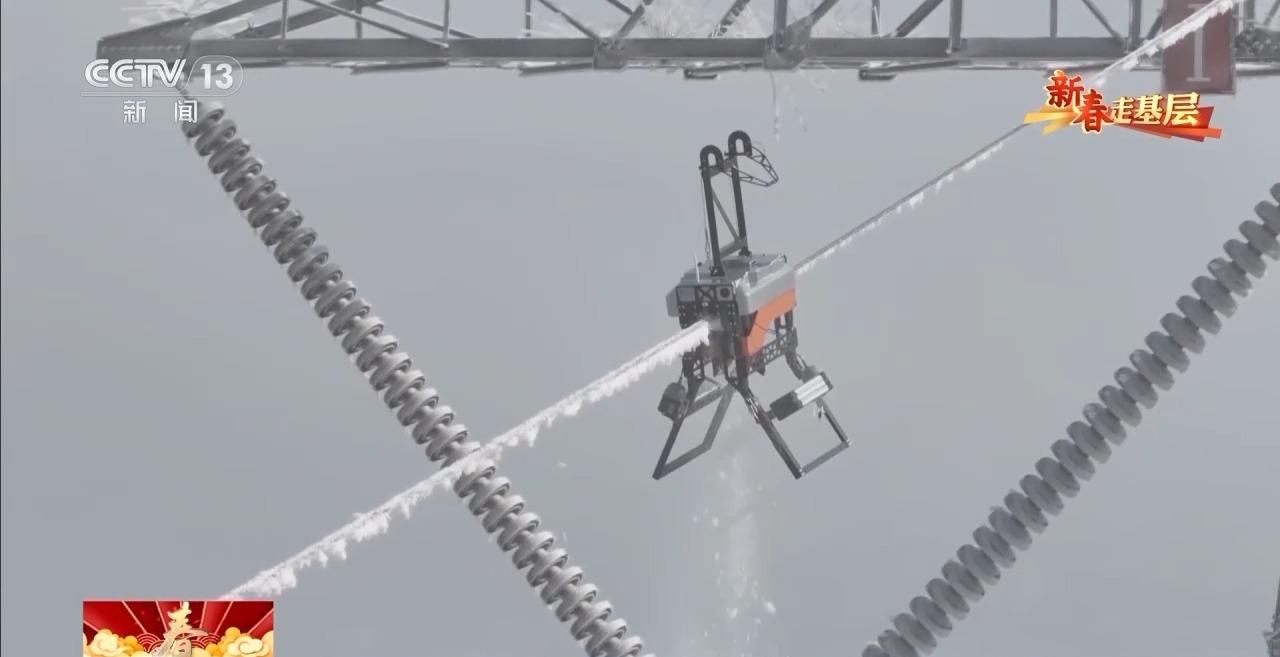 不斷旋轉(zhuǎn)的履帶,是它的雙腳。它一邊快速向前,一邊擠壓導線上的覆冰。1分鐘左右,20多米長的導線,覆冰全部被清理干凈。