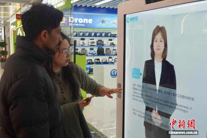 2月28日,浙江義烏,中外客商在店鋪門前與多語(yǔ)種數(shù)字人對(duì)話。董易鑫 攝