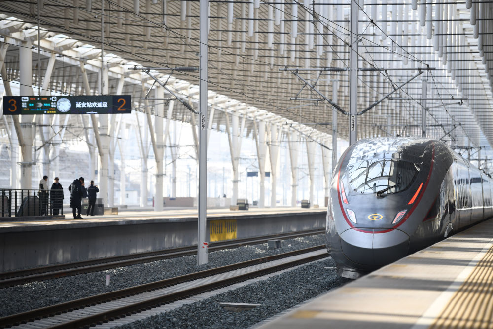 2025年12月26日,西安至延安高鐵開通運營。至此,中國高鐵運營里程突破5萬公里。這是西延高鐵首發(fā)列車從延安站駛出。新華社記者 張博文 攝