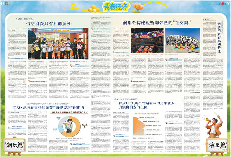 消費(fèi)端彰顯“青春經(jīng)濟(jì)”活力。青年消費(fèi)者追求的不再是單一產(chǎn)品,而是更加注重情感共鳴、文化認(rèn)同和價(jià)值表達(dá),由“性價(jià)比”轉(zhuǎn)向“心價(jià)比”。中青報(bào)及中青校媒記者調(diào)研發(fā)現(xiàn),61.2%的受訪青年會(huì)為了釋放壓力、調(diào)節(jié)情緒而為演出花錢,62.5%的受訪青年認(rèn)為購(gòu)買潮玩盲盒是在為情緒買單。國(guó)研新經(jīng)濟(jì)研究院創(chuàng)始院長(zhǎng)朱克力認(rèn)為,年輕一代的消費(fèi)正變得越來(lái)越多元化、個(gè)性化,充滿文化感、設(shè)計(jì)感和科技感?!斑@些特性與社會(huì)躍遷密切相關(guān)。”