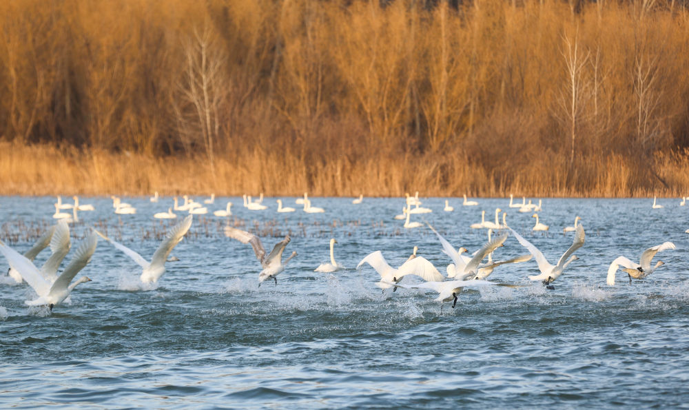 每年11月下旬至次年3月,大天鵝都會到位于黃河中游的三門峽黃河濕地越冬。據(jù)三門峽黃河天鵝湖濕地保護中心統(tǒng)計,天鵝數(shù)量從20世紀(jì)90年代的幾十只,增至如今的1.6萬余只。