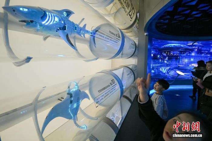 1月30日,游客在位于天津?yàn)I海新區(qū)的國家海洋博物館“未來海洋”展廳參觀各種海洋仿生機(jī)器人?!≈行律缬浾?佟郁 攝