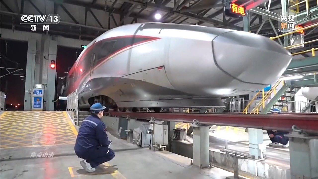 深夜時分,從廣州南站開來的G424次列車緩緩進入檢修庫。這是一列16節(jié)編組的復興號智能動車組,頭一天它從鄭州東站出發(fā)前往廣州南站,又從廣州南站到北京西站,稍作停留后,第二天又開回廣州南站,最后返回鄭州東站。相當于兩天的時間,就在大半個中國跑了一個來回。