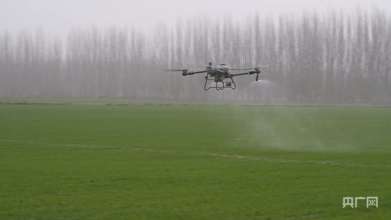 植保無人機正在阿克蘇市麥田上空開展飛防作業(yè) (央廣網(wǎng)發(fā) 熱普亥提·阿不力米提 攝)