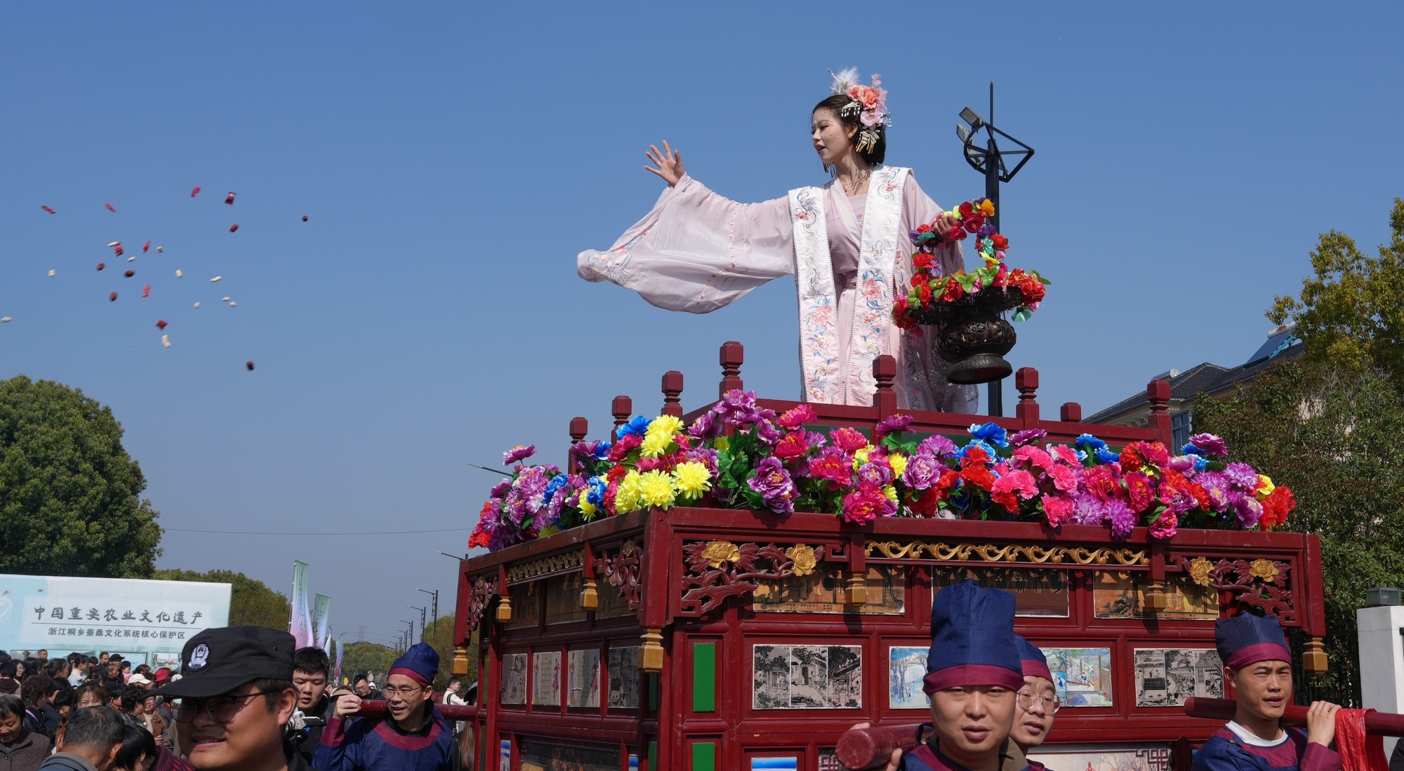 當天上午,蠶花“禮”民俗儀式上,每一個環(huán)節(jié)都承載著蠶鄉(xiāng)兒女對風調雨順、蠶花茂盛的美好祈愿。最令人期待的當屬民俗巡游展演。來自桐鄉(xiāng)全市各鎮(zhèn)(街道)的民間民俗隊伍浩浩蕩蕩穿行于村道之間;蠶花仙子與十二花神乘花船翩然而至,沿途撒下寄托祝福的蠶花,與游客互動答題。