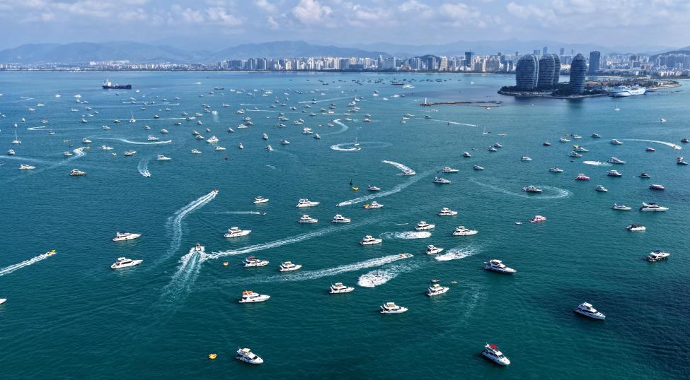 2月21日,游客在三亞乘船游玩(無(wú)人機(jī)照片)。新華社記者 趙穎全 攝