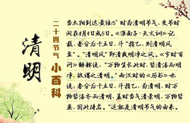 節(jié)選自《二十四節(jié)氣志》/宋英杰 4月5日前后為清明節(jié)氣,氣清景明之意,正是鳥語花香的盛春時節(jié)?!把匀f物去故而從新,莫不鮮明之謂也?!薄叭f物生長此時,皆清凈明潔,故謂之清明?!鼻迕髦?,便表征了這一時節(jié)的天氣是清新、明媚、和暖的。