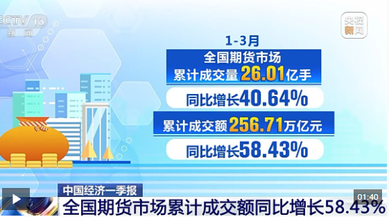 數(shù)據(jù)顯示,1-3月全國期貨市場累計成交量為26.01億手,累計成交額為256.71萬億元,同比分別增長40.64%和58.43%。