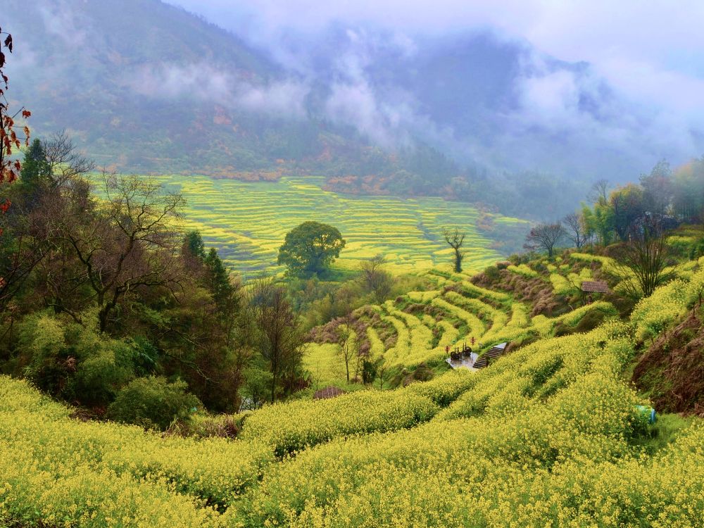 清晨的婺源江嶺景區(qū),晨霧剛剛散去,萬畝梯田便在春光里鋪展開來,金黃的油菜花順著山勢層層疊疊涌向山腳。