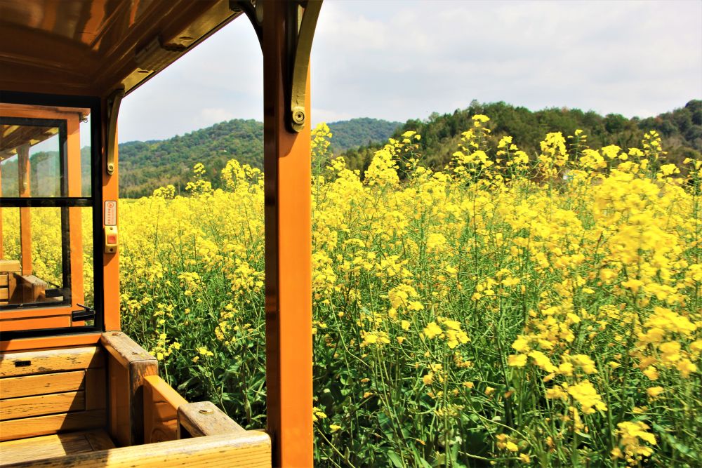 坐在車廂里向外望去,漫山遍野的油菜花隨風(fēng)起伏,如金色的海洋,粉墻黛瓦的古村散落其間,春耕的農(nóng)人在田間勞作,構(gòu)成一幅鮮活的田園圖景。游客們紛紛舉起相機,定格下這人與自然和諧共生的春日美景,偶爾有花瓣落在車窗上,更添幾分詩意。