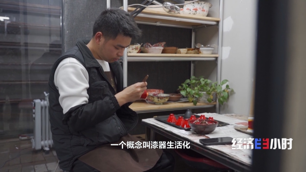 這個(gè)開(kāi)設(shè)在茶館里的漆器文創(chuàng)店,獨(dú)特之處在于采購(gòu)體驗(yàn)于一體。漆器不再被鎖進(jìn)玻璃柜,而是被放置在茶桌旁、展示架上。消費(fèi)者可以上手體驗(yàn)簡(jiǎn)單的打磨工序。