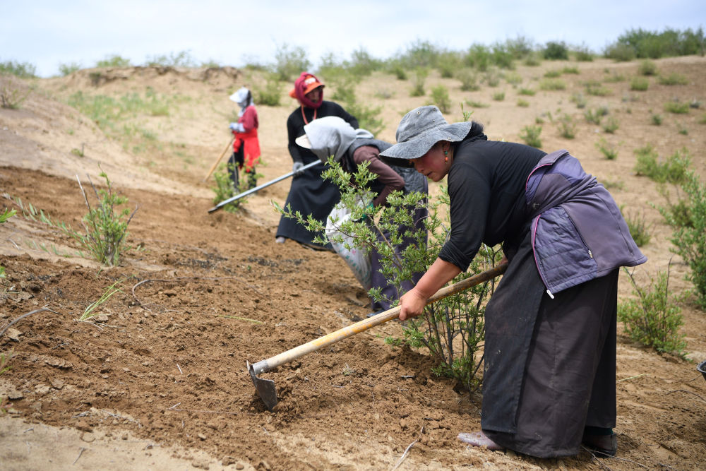 2023年7月6日,牧民在甘肅省甘南藏族自治州瑪曲縣歐拉鎮(zhèn)黃河沿岸一處沙化草原治理點補種草籽。