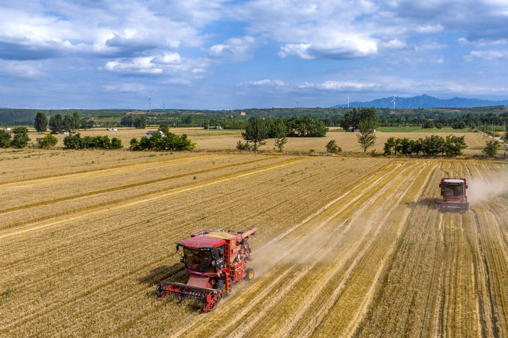 2024年6月5日,收割機(jī)在河南三門(mén)峽靈寶市的麥田里收獲小麥。新華社發(fā)(杜杰 攝)