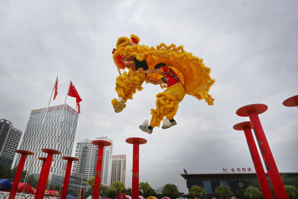 2025年1月22日,鶴山禧誠龍獅隊(duì)在廣東省佛山市禪城區(qū)南莊鎮(zhèn)進(jìn)行梅花樁舞獅表演。