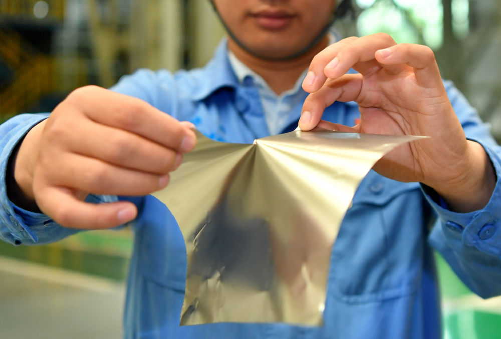 在位于山西的太鋼集團(tuán),員工展示用手撕開0.02毫米厚的超薄帶狀不銹鋼(2019年5月24日攝)。