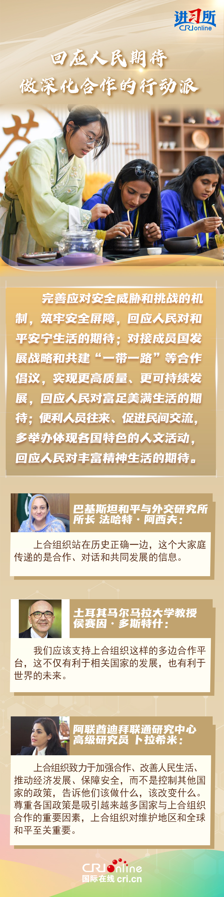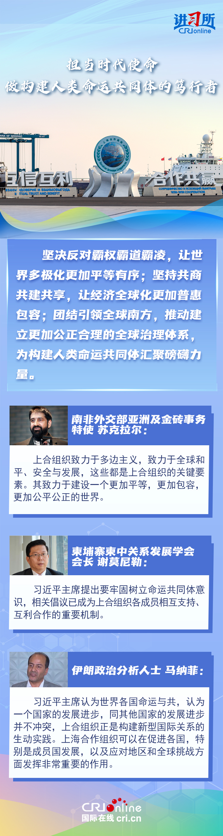 “讓‘上海精神’持續(xù)照亮構(gòu)建上海合作組織命運(yùn)共同體之路?!鄙虾:献鹘M織成立24年來(lái),始終秉持“上海精神”,成功走出了一條順應(yīng)時(shí)代潮流、契合各方需求的區(qū)域合作道路,樹(shù)立起新型國(guó)際關(guān)系的典范。在國(guó)際人士眼中,上海合作組織站在歷史正確一邊,致力于建設(shè)一個(gè)更加平等,更加包容,更加公平公正的世界,對(duì)維護(hù)地區(qū)和全球和平至關(guān)重要。