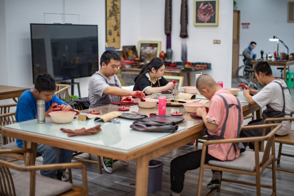 2023年9月18日,在重慶市城口縣的“忘我”大漆藝術(shù)空間,殘障員工打磨漆器產(chǎn)品。“忘我”大漆藝術(shù)空間集殘疾人漆藝培訓(xùn)、輔助性就業(yè)、職業(yè)康復(fù)、日間照料等功能于一體,利用當(dāng)?shù)氐拇竽酒豳Y源,組織殘疾人創(chuàng)作漆器產(chǎn)品。