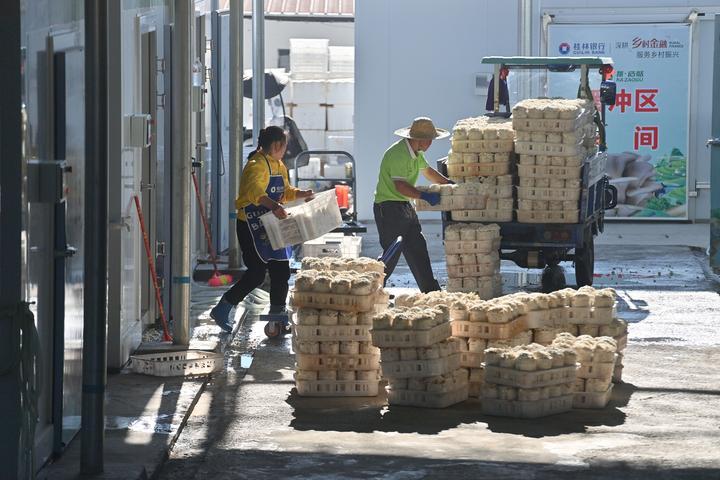 2024年10月31日,村民在廣西百色市德保縣那造村食用菌生產(chǎn)基地搬運采摘的蘑菇。那造村通過做優(yōu)特色產(chǎn)業(yè)、豐富村民生活、完善基礎(chǔ)設(shè)施等多項具體舉措,推動各項事業(yè)快速發(fā)展。