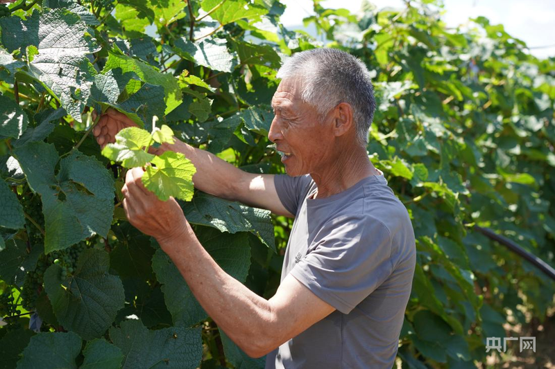 盛夏時節(jié),內(nèi)蒙古赤峰市喀喇沁旗馬鞍山村綠意盎然,一串串山葡萄綴滿枝頭,村民張國利和妻子趙國俠正忙著田間管護(hù)?!跋襁@棵秧能結(jié)10斤左右山葡萄,一畝地能收約3000斤、賣6000元左右?!睆垏f。