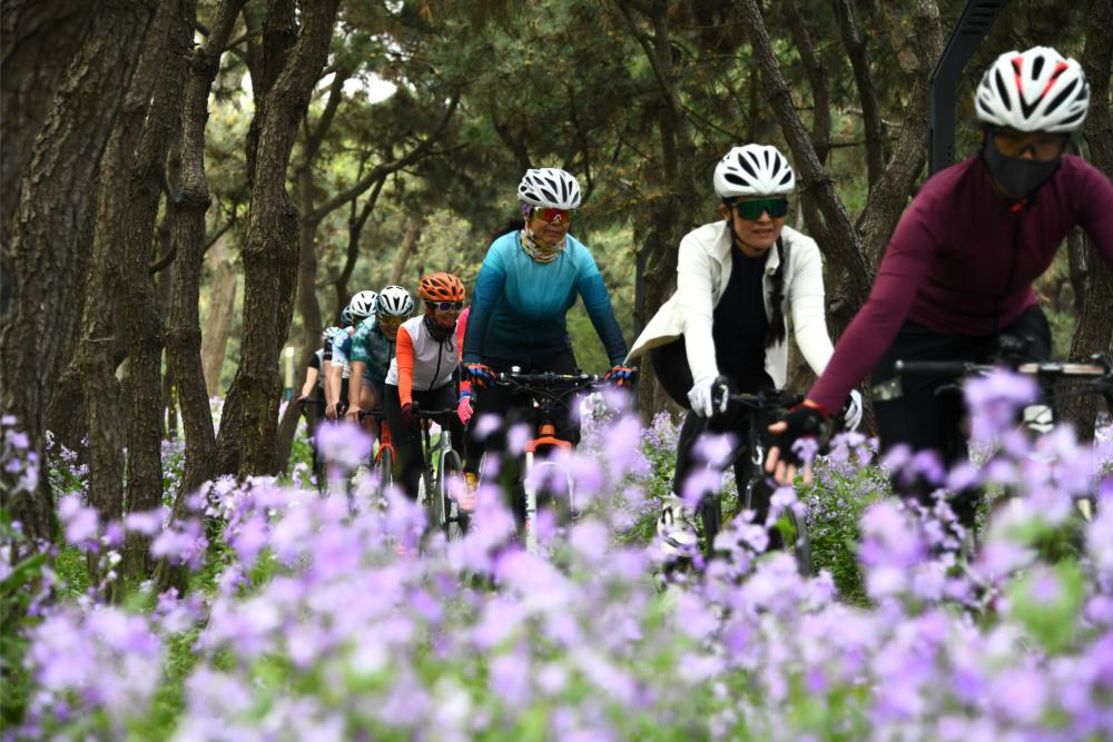 2025年4月19日,自行車運(yùn)動(dòng)愛(ài)好者在山東日照的海濱騎行綠道騎行。