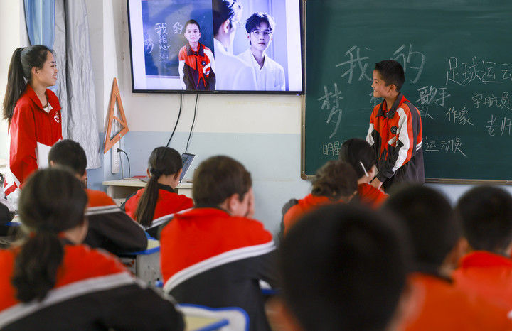 新疆克孜勒蘇柯爾克孜自治州阿圖什市哈拉峻鄉(xiāng)謝依特小學,是一所主要面向柯爾克孜族學生的村級小學,2022年8月成為該州首個西部計劃志愿者包校支教的試點學校。23名戍邊支教西部計劃志愿者服務(wù)隊的志愿者,在這所小學承擔著教書育人的工作。經(jīng)過近三年的支教服務(wù),學生的學習成績顯著提高,得到當?shù)貜V泛認可。這是2025年4月23日,支教教師高淑賢(左一)在班級里展示她為學生們制作的“AI夢想職業(yè)照”。
