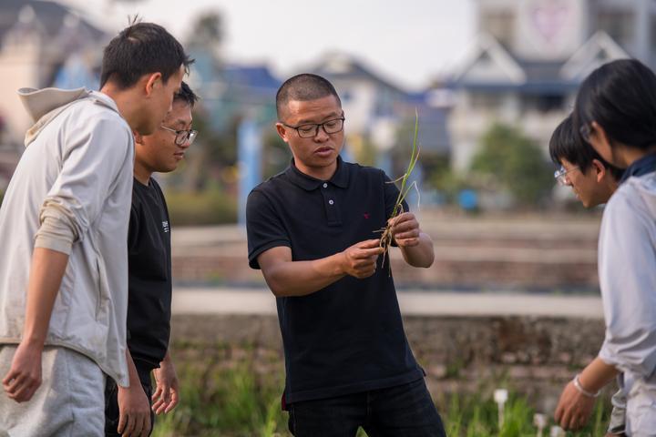 今年37歲的黃光福是云南大學農(nóng)學院的一名青年教師,同時也是云南大學在云南省勐??h勐遮鎮(zhèn)曼恩村成立的多年生稻科技小院的負責人。多年來,他帶領(lǐng)學生扎根田間,進行技術(shù)攻關(guān)。團隊利用長雄野生稻特有的地下莖無性繁殖能力,成功培育出“云大25”“云大107”等新品種,突破性地實現(xiàn)水稻“一次栽種、連續(xù)收割”,讓“割韭菜般收稻子”的農(nóng)業(yè)成果從實驗室走向田間地頭。這是2025年2月27日,青年教師黃光福(中)在試驗田間給學生授課。