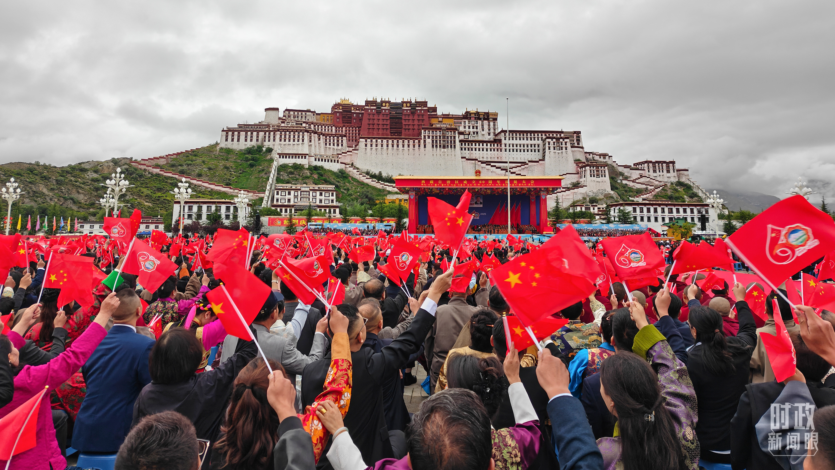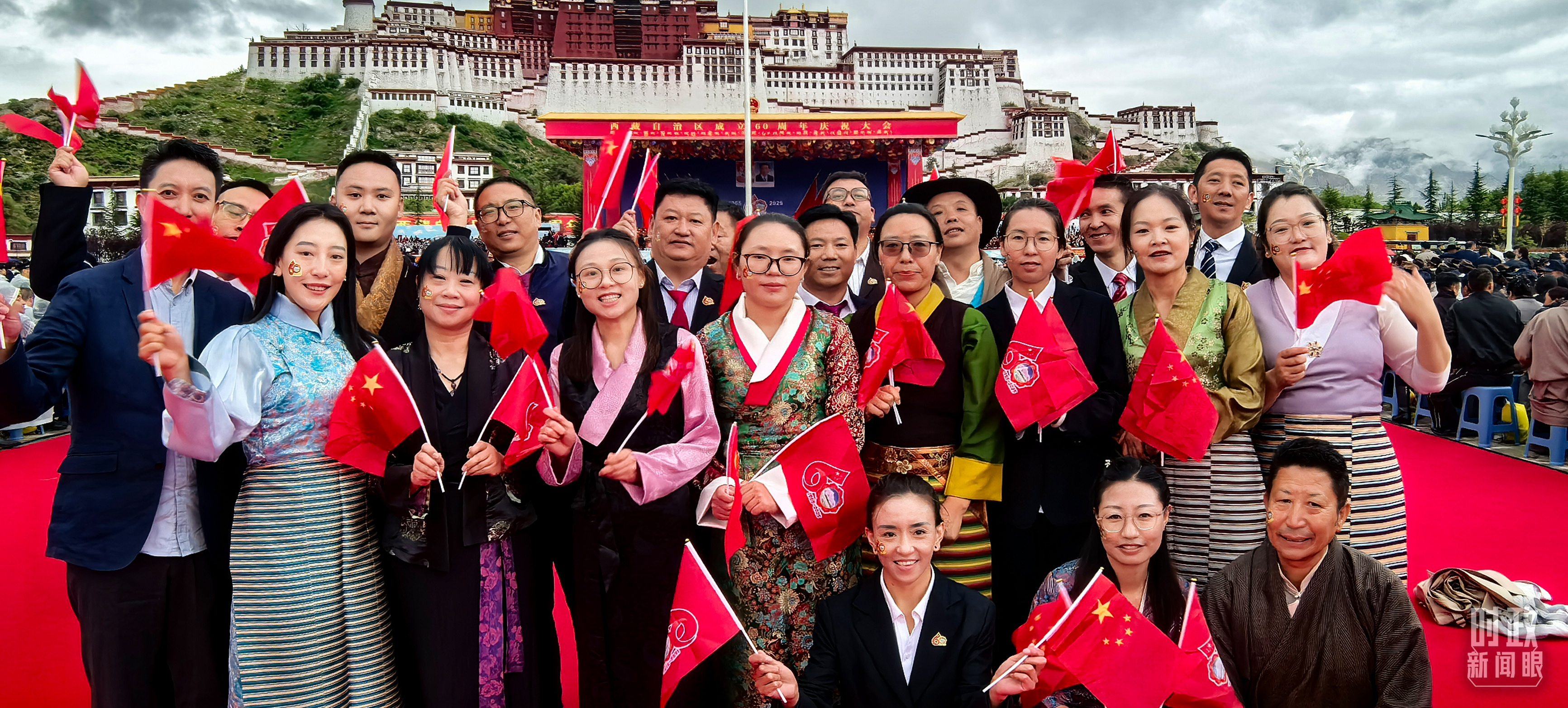 慶祝大會的會場設(shè)置在雄偉的布達拉宮前,位于群山環(huán)抱之中。大會主席臺采用藏式風(fēng)格。約2萬人歡聚布達拉宮廣場,紅、黃、白、藍等體現(xiàn)藏族文化基因的色彩鋪滿眼前,烘托出吉祥喜慶的濃烈氛圍。