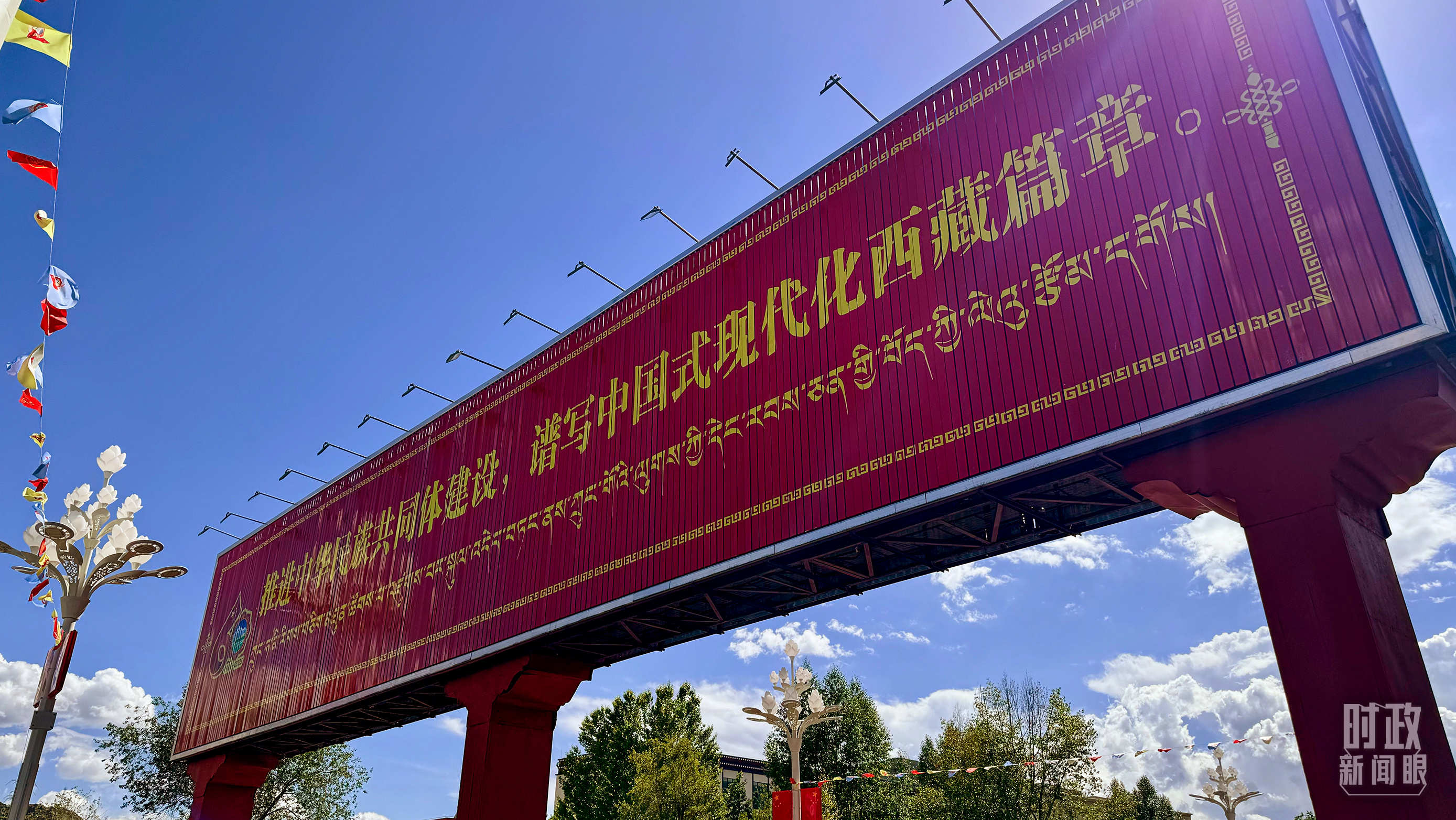 西藏自治區(qū)成立60周年標語牌。(總臺央視記者張宇拍攝)