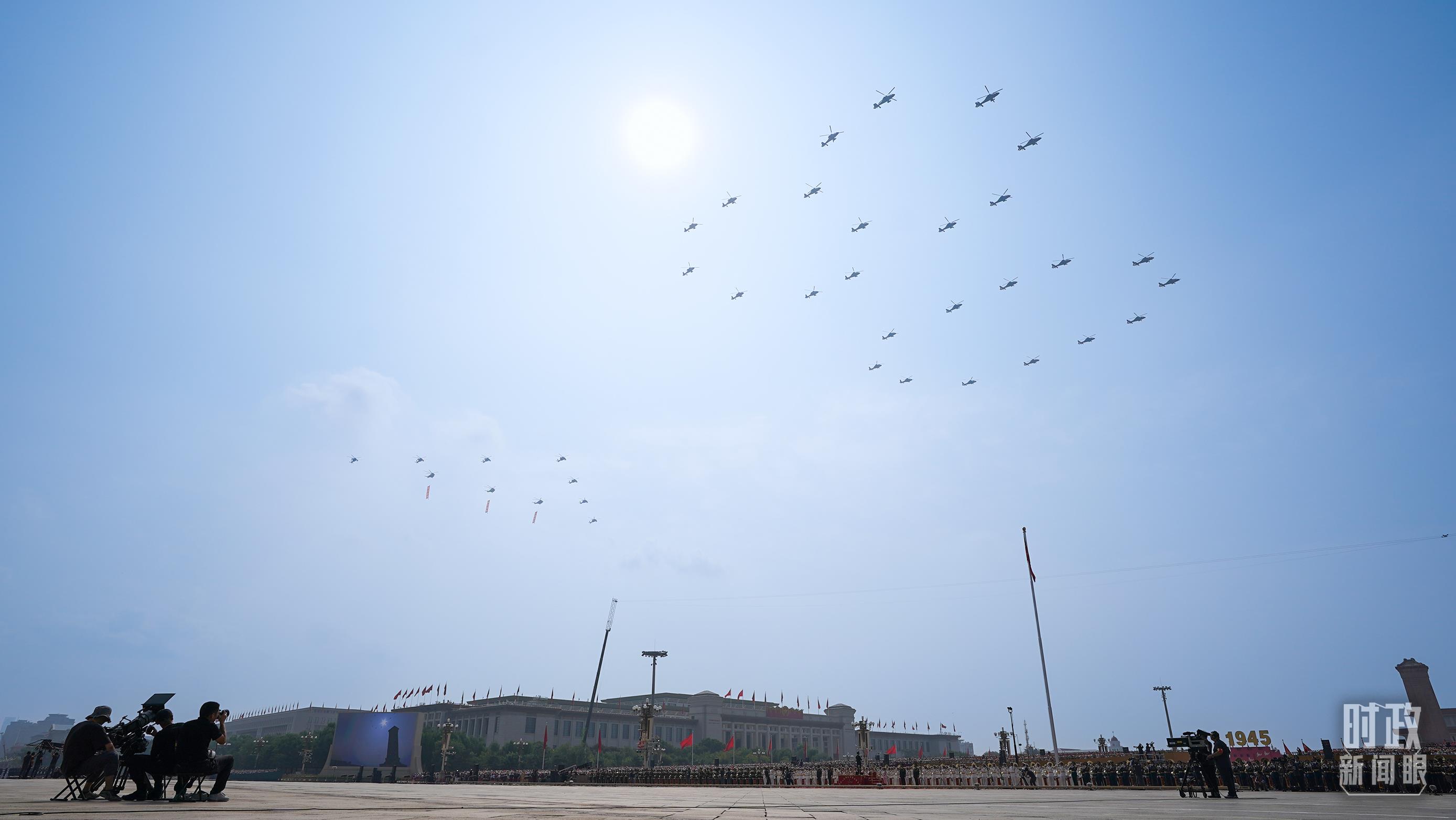 △9月3日,3架直升機(jī)分別懸掛“正義必勝”“和平必勝”“人民必勝”條幅飛過天安門廣場(chǎng)。(總臺(tái)記者李晉拍攝)