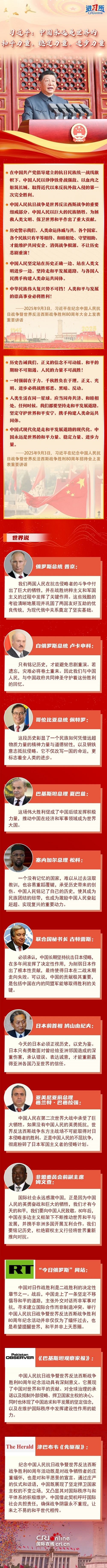 “中國永遠(yuǎn)是世界的和平力量、穩(wěn)定力量、進(jìn)步力量?!睆膭?chuàng)建聯(lián)合國到提出和平共處五項(xiàng)原則,再到推動(dòng)構(gòu)建人類命運(yùn)共同體,中國始終面向光明,做世界和平與安全的堅(jiān)定維護(hù)者。國際社會(huì)高度評(píng)價(jià)中國為世界反法西斯戰(zhàn)爭勝利作出的巨大貢獻(xiàn),認(rèn)為抗戰(zhàn)不僅改寫中國的命運(yùn),更標(biāo)志著全人類的進(jìn)步;戰(zhàn)后的中國走上了一條堅(jiān)定不移倡導(dǎo)和平發(fā)展的道路,并以此次紀(jì)念活動(dòng)為契機(jī),呼吁國際社會(huì)共擔(dān)責(zé)任,確保戰(zhàn)爭陰霾永不重現(xiàn),讓來之不易的和平世代相傳。