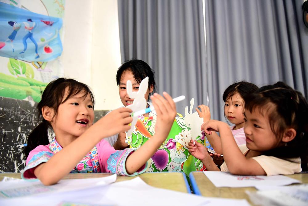 2025年7月16日,貴州黔東南州從江縣,江南大學支教老師在獨洞小學指導學生制作繪本彩繪。