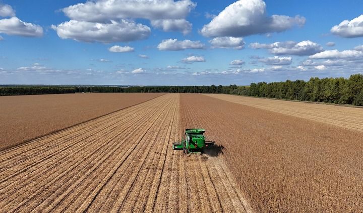 2025年9月19日,在北大荒集團(tuán)黑龍江格球山農(nóng)場有限公司大豆地塊,收獲機(jī)車在進(jìn)行收獲作業(yè)(無人機(jī)照片)。新華社發(fā)(陸文祥攝)