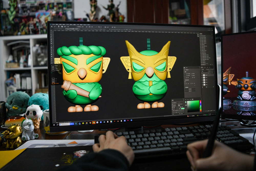 2025年3月1日,文創(chuàng)產(chǎn)品策劃運(yùn)營(yíng)師曾舟在位于四川成都的辦公室內(nèi)完善文創(chuàng)產(chǎn)品細(xì)節(jié)。他以三星堆青銅神樹、青銅縱目面具、青銅獸面等文物為創(chuàng)作藍(lán)本,結(jié)合潮玩元素設(shè)計(jì)的文創(chuàng)作品廣受歡迎?!拔蚁胱龅牟皇峭婢呖煜?,而是有內(nèi)容、有溫度、有意義的文化IP,讓年輕一代隨手摸到沉淀千年的文化?!痹壅f(shuō)。
