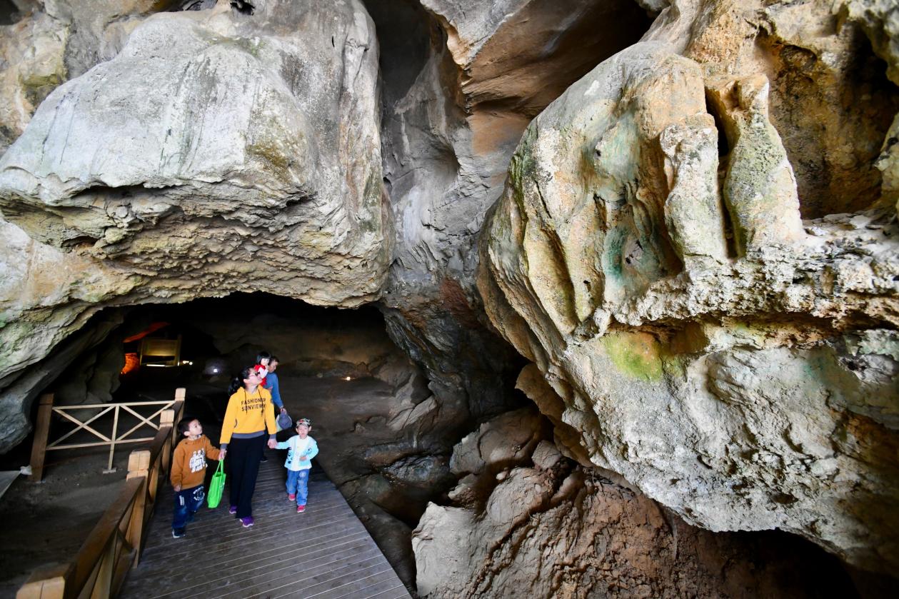 游客在萬(wàn)壽巖遺址船帆洞內(nèi)游覽。